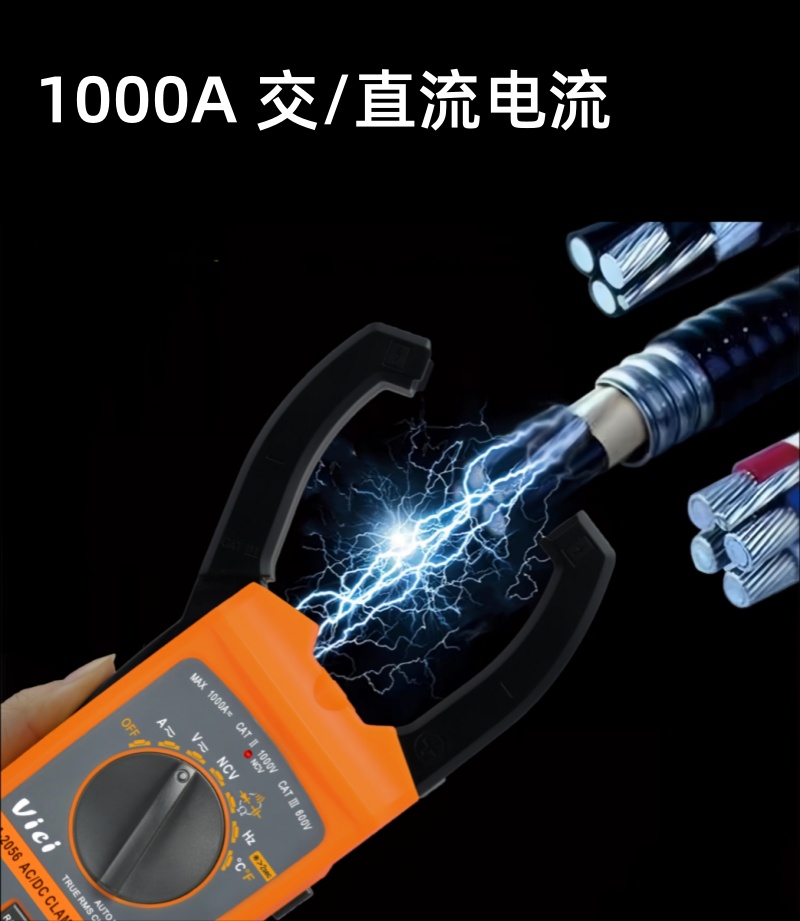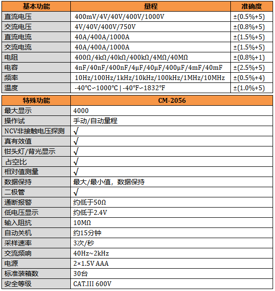 CM-2056 交直流1000A真有效值測量, 電容,頻率,溫度測量,NCV功能,背光顯示,鉗頭照明。