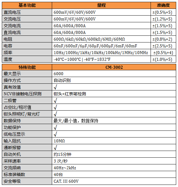 800A交直流大彩屏智能鉗形表CM-3002:自動識別一鍵測量功能,鉗頭手電筒照明/背光顯示,真有效值、NCV功能、占空比、相對值、數據保持、低電壓提醒、自動關機。