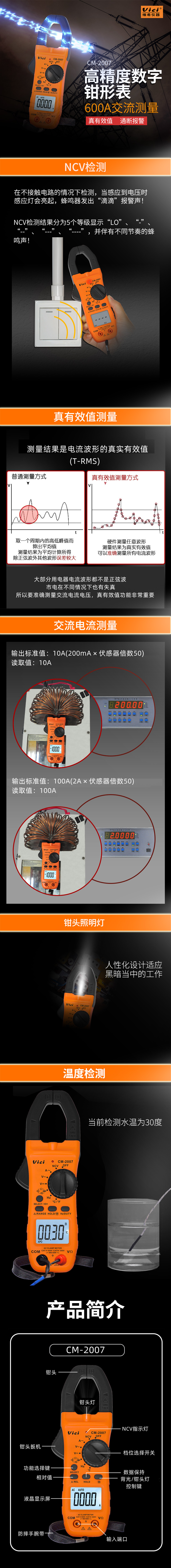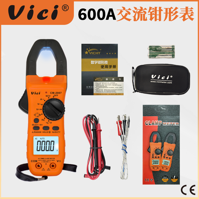 CM-2007 鉗口張開28mm,800A真有效值測量,電容,頻率,溫度測量,NCV功能,背光顯示,鉗頭照明。
