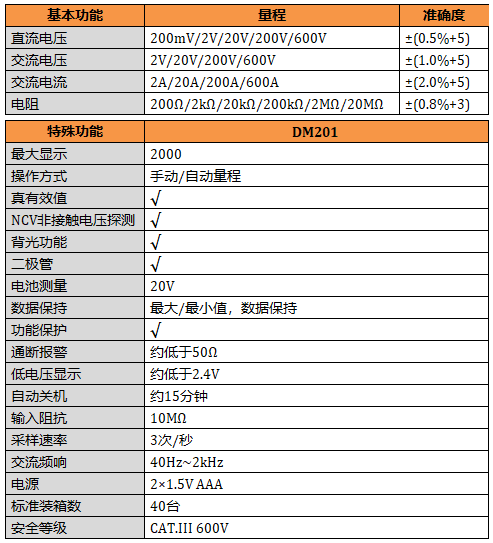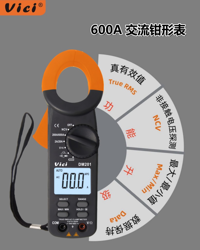 DM201 鉗口張開35mm,真有效值測量,NCV功能,電池測量,背光顯示。