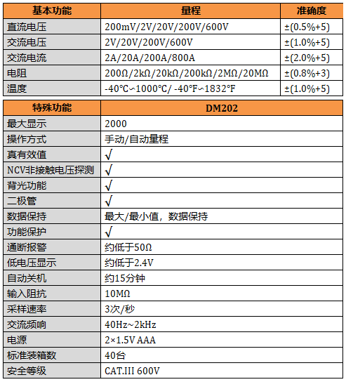 DM202 鉗口張開35mm,真有效值測量,NCV功能,溫度測量,背光顯示。
