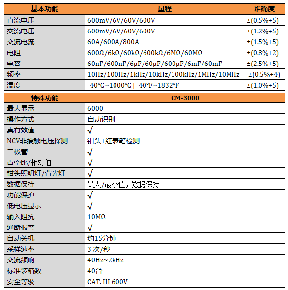 800交流大彩屏智能鉗形表CM3000:鉗頭開口28mm,自動識別一鍵測試;NCV(鉗頭+紅表筆檢測)、真有效值測量; 數據保持、占空比、相對值、低電壓顯示 、自動關機。
