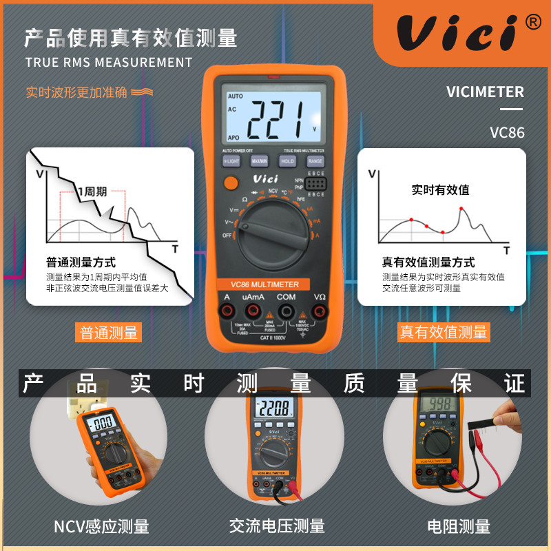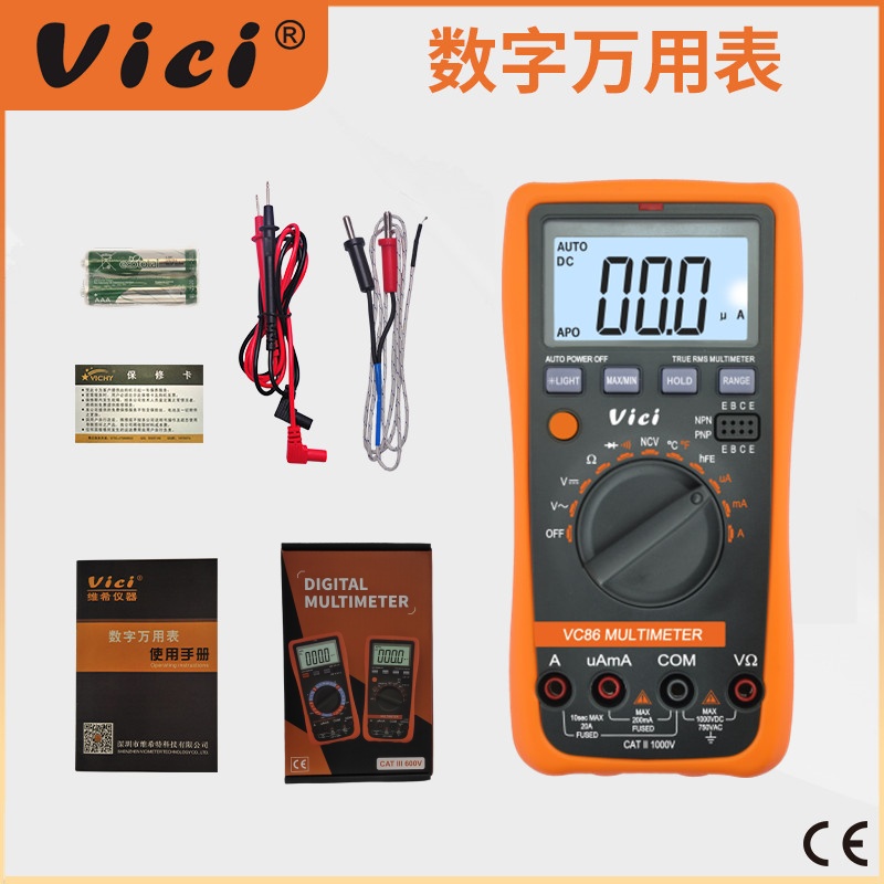 VC86 真有效值測量,NCV測量,最大值、最小值測量,讀數保持,背光顯示。