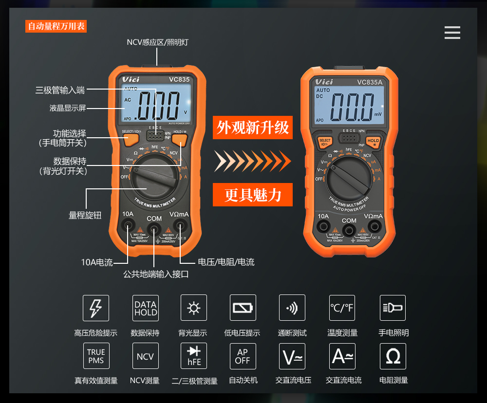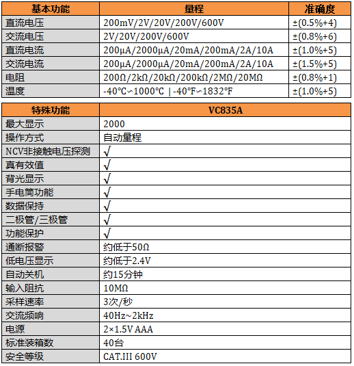VC835A 真有效值測量,NCV測量,讀數保持,背光顯示,照明功能。