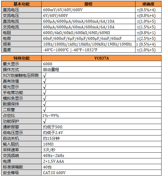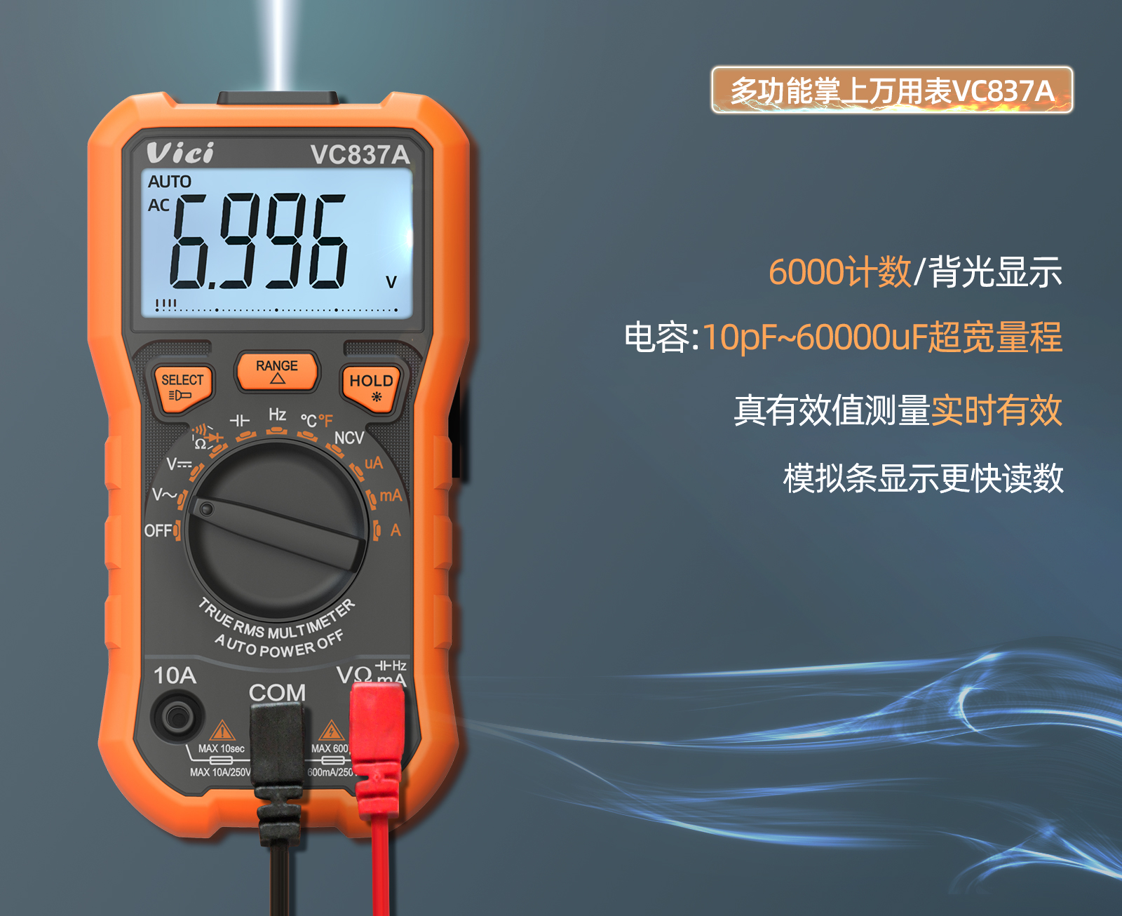 VC837A 真有效值測量,模擬條顯示,NCV測量,讀數保持,背光顯示,照明功能。