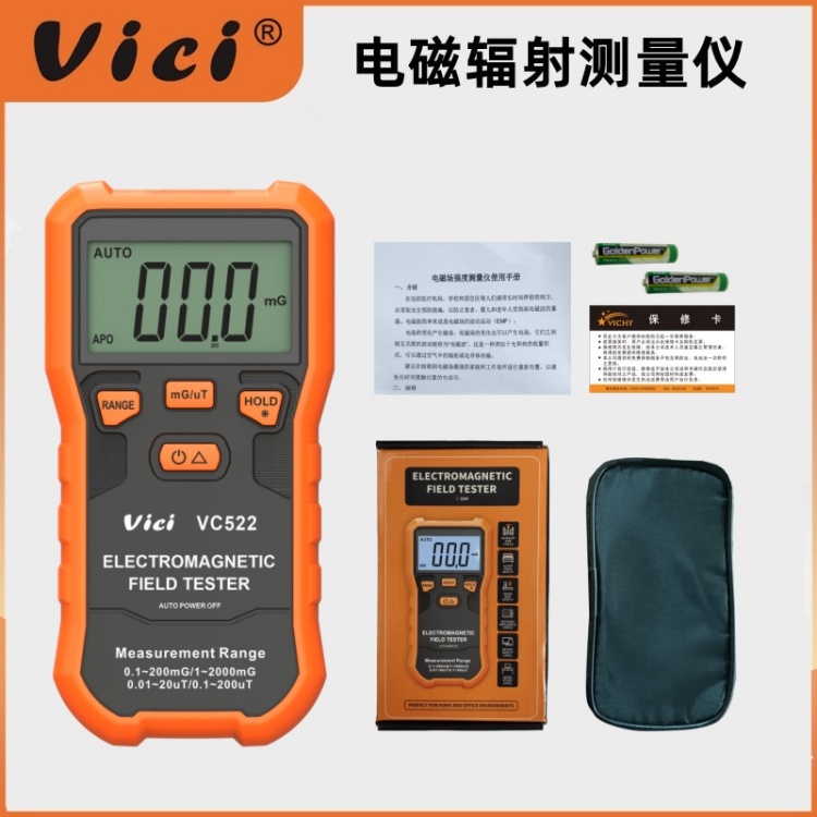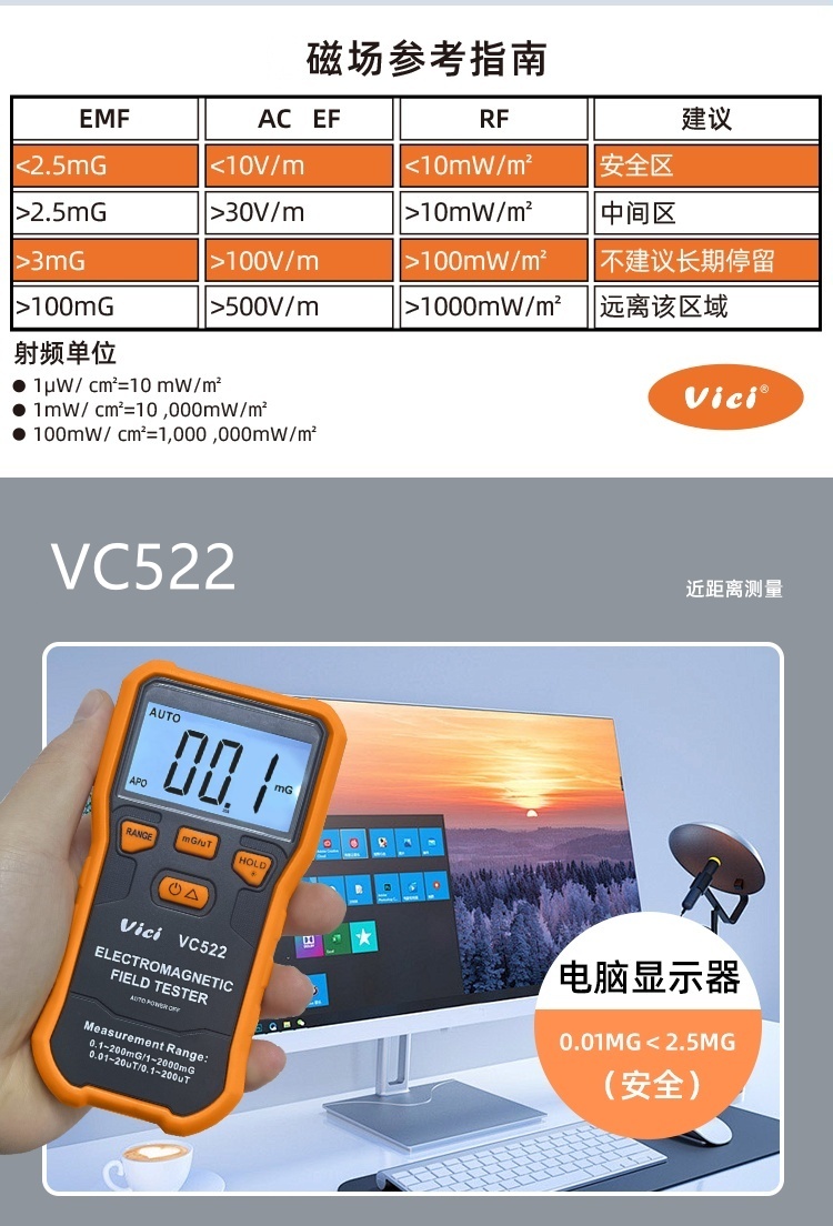可用于測量30至1千赫茲的極低頻電磁場(ELF);能夠測量由電傳輸設備、電力線、微波爐、空調、冰箱、計算機顯示器、視頻/音頻/網絡設備等產生的電磁場輻射強度;磁場單位為特斯拉(T)、高斯(G)、毫高斯(mG)或微特斯拉(μT),VC522電磁輻射檢測儀:了解周圍的電磁狀況,可以更加合理地安排家中的家電布局,為全家人的健康保駕護航。