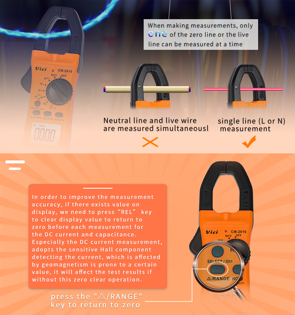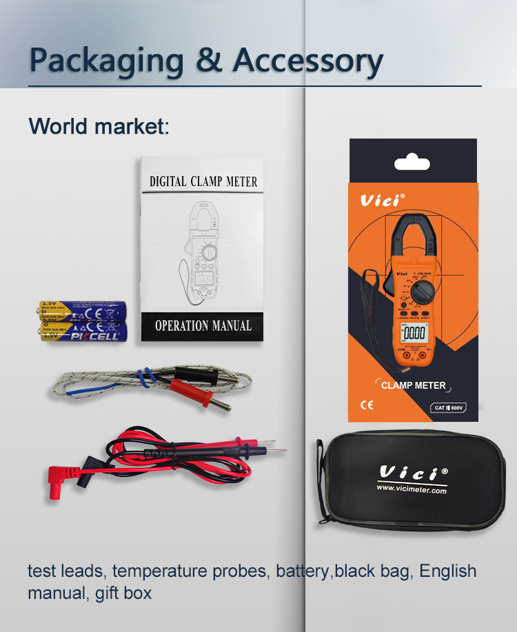 CM-2016 clamp meter, available to DC voltage, AC voltage, DC current, AC current, resistance, capacitance, frequency, non-contact voltage, temperature, diode and continuity tests; Designed with unit symbol and backlight display, data hold, clamp lighting, auto ranging switch, auto power off and alarm functions.