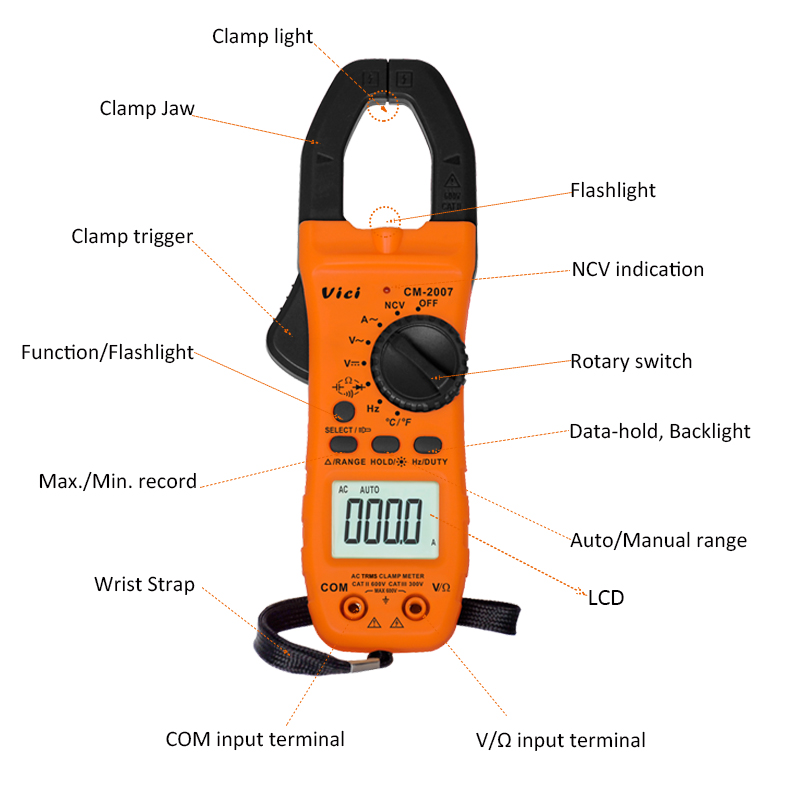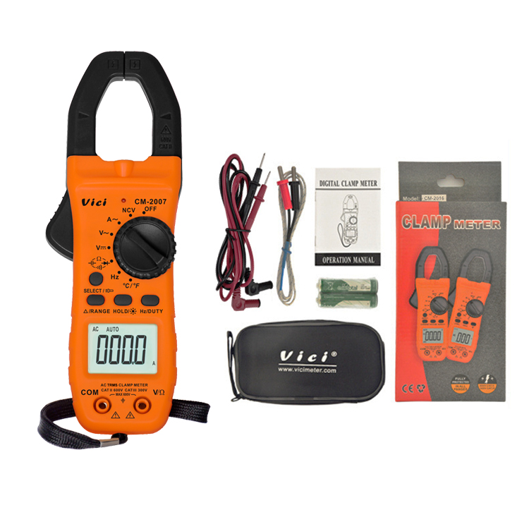 CM-2007 clamp meter, available to DC voltage, AC voltage, AC current, resistance, capacitance, frequency, non-contact voltage, temperature, diode and continuity tests; Designed with unit symbol and backlight display, data hold, clamp lighting, auto ranging switch, auto power and alarm functions.