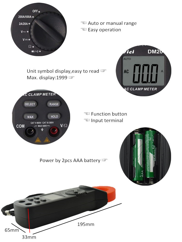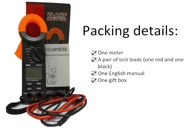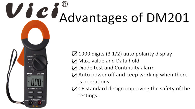 DM201 clamp meter, DC voltage, AC voltage, AC current, resistance, non-contact voltage, battery, diode and continuity tests; Designed with unit symbol and backlight display, data hold, auto ranging switch, auto power off and alarm functions.