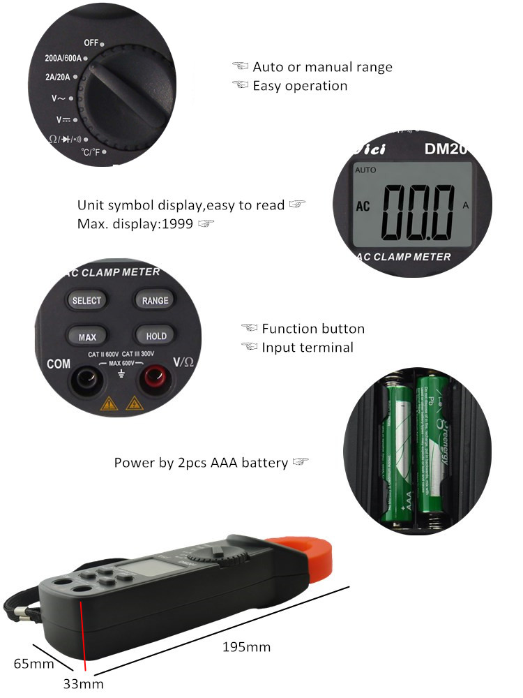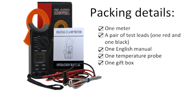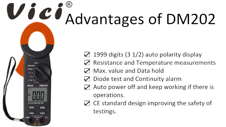 DM202 clamp meter, available to DC voltage, AC voltage, AC current, resistance, non-contact voltage, temperature, diode and continuity tests; Designed with unit symbol and backlight display, data hold, auto ranging switch, auto power off and alarm functions.