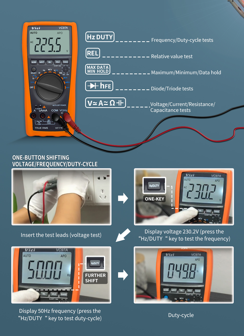 VC97A multimeter, available to DC voltage, AC voltage, DC current, AC current, resistance, capacitance, frequency, non-contact voltage detection, duty cycle, temperature, diode and continuity tests; Designed with unit symbol display and maximum and minimum value measurement, data hold, auto ranging switch, auto power off and alarm functions.