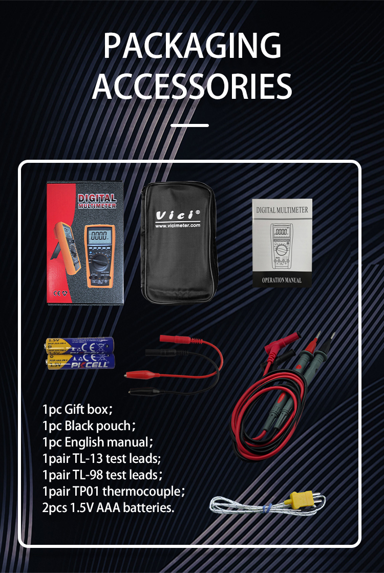 VC99 multimeter, available to DC voltage, AC voltage, DC current, AC current, resistance, capacitance, frequency, non-contact voltage detection, duty cycle, temperature, diode and continuity tests; Designed with unit symbol display and analog bar display, max and min value measurement, data hold, auto ranging switch, auto power off and alarm functions.