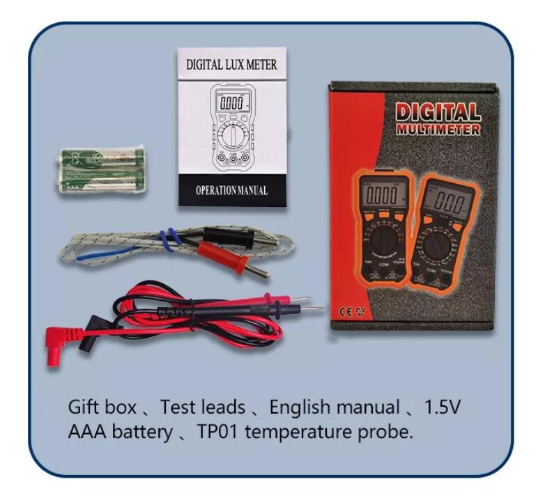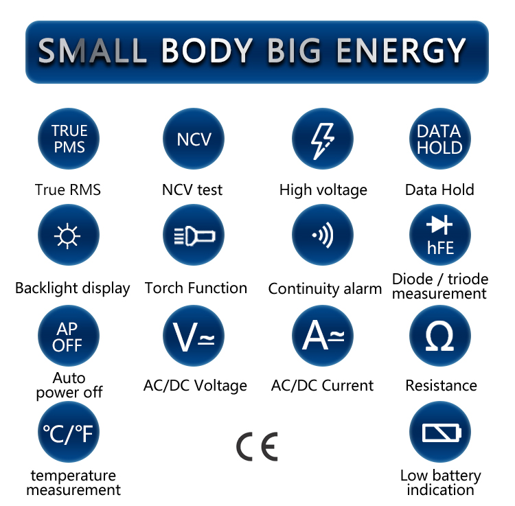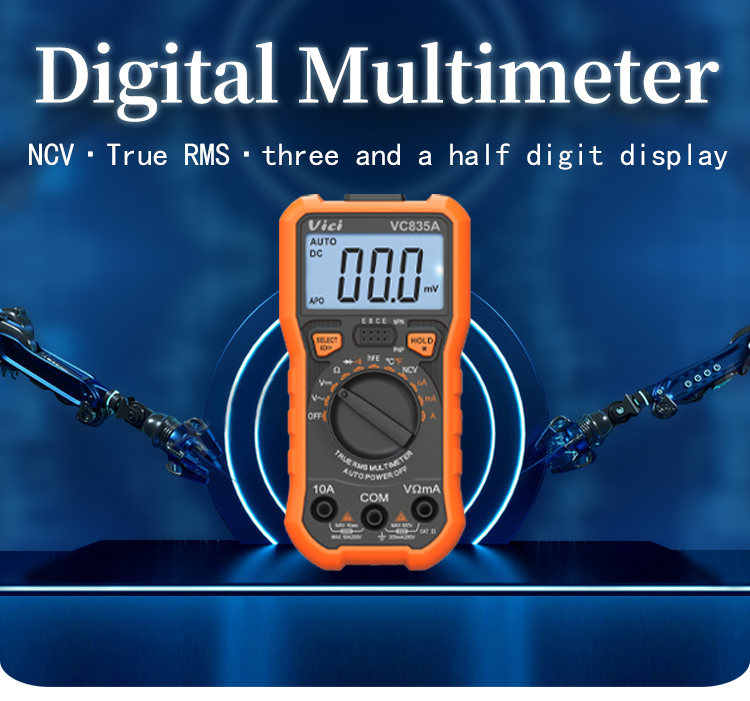 VC835A multimeter, available to DC voltage, AC voltage, DC current, AC current, Resistance, Non-contact voltage (NCV), Temperature, hFE, Diode and Continuity tests; Designed with unit symbol, Backlight display, Data hold, Torch lighting, Auto ranging switch, Auto power off and Alarm functions.