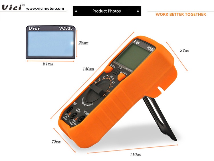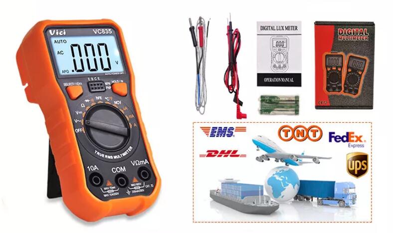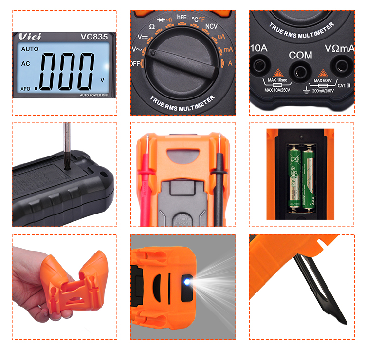 VC835 multimeter, available to DC voltage, AC voltage, DC current, AC current, resistance, non-contact voltage detecting, temperature, hFE, Diode and continuity tests; Designed with unit symbol, backlight display, data hold, torch lighting, auto range switch, auto power and alrm functions.