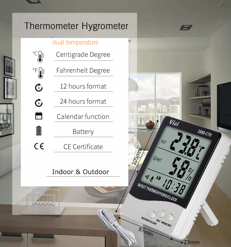 230B-CTH dual temperature testing thermo-hygrometer can be placed or hung in living rooms, bedrooms, offices, warehouses, specially designed for monitoring outdoor temperatures in cold winters and monitoring temperatures in refrigerated warehouses. Monitor the indoor environment temperature and humidity and outdoor temperature at any time, monitor the temperature and humidity outside the frozen warehouse and the internal temperature, ensure a comfortable space and sleeping conditions, and ensure that the stored materials will not deteriorate.