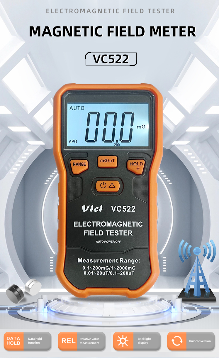 VC522 This meter is applied to measuring electromagnetic fields of extremely low frequency (ELF) of 30 to 1kHz. It is capable of measuring the electromagnetic field radiation intensity that is produced from electric transmission equipment, power line, microwave oven, air conditioner, refrigerator, computer monitor, video/audio/network device and so forth. The magnetic field unit is Tesla (T), Gauss (G), milli-Gauss (mG) or micro-Tesla (μT).