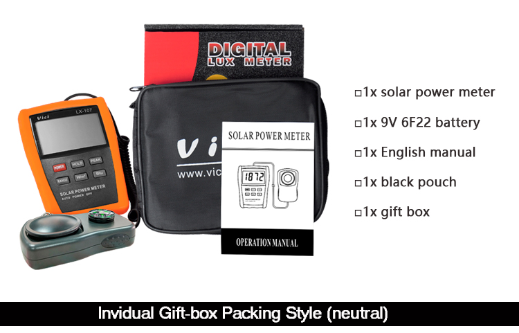 LX-107 solar power meter is for testing solar installation, which is mainly used in solar radiation measurement, solar research, physics and optical laboratories, identification of high-performance windows, in meteorology, agriculture, industry and wide applications.