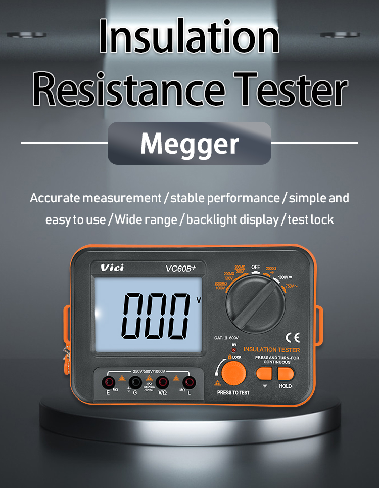 VC60B+ insulation tester, with safety protection high voltage warning, insulation breakdown short circuit alarm, continuous insulation test device for specific environment, accurate and safe for you to use with peace of mind. It can test the insulation resistance between various generators, motors, power sockets, cables, enameled coils, conductors and non-conductors on trains, EMUs, and equipment.