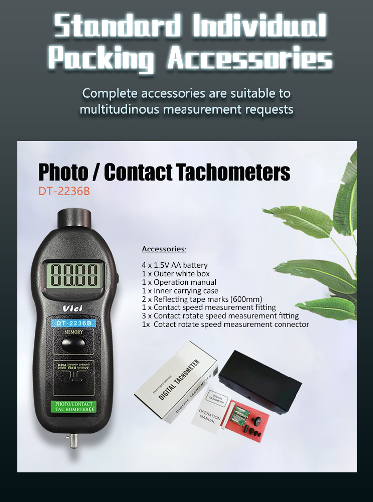 DT-2236B non-contact photo and contact rpm digital tachometer is mainly used for touchless speed testing of rotors such as various engines, motors, speed control devices and wire speed tests of various conveyor belts. It is used in the speed debugging of various devices such as aircraft, ships, EMUs, automobiles, model aircraft, toys, etc.; and the surface speed debugging of assembly lines and transmission dials.