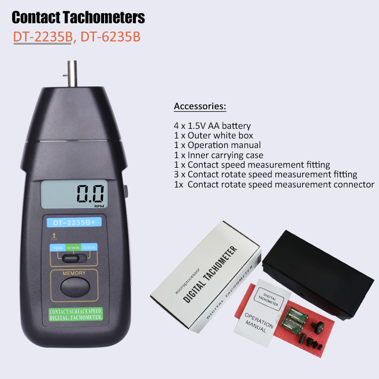 DT-2235B contact rpm digital tachometer is used for speed testing of rotors such as various engines, motors, speed control devices and wire speed tests of various conveyor belts. It is used in the speed debugging of various devices such as aircraft, ships, EMUs, automobiles, model aircraft, toys, etc.; and the surface speed debugging of assembly lines and transmission dials.