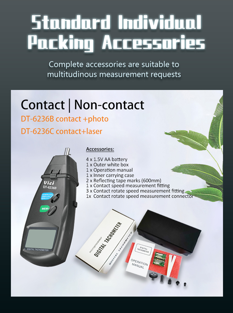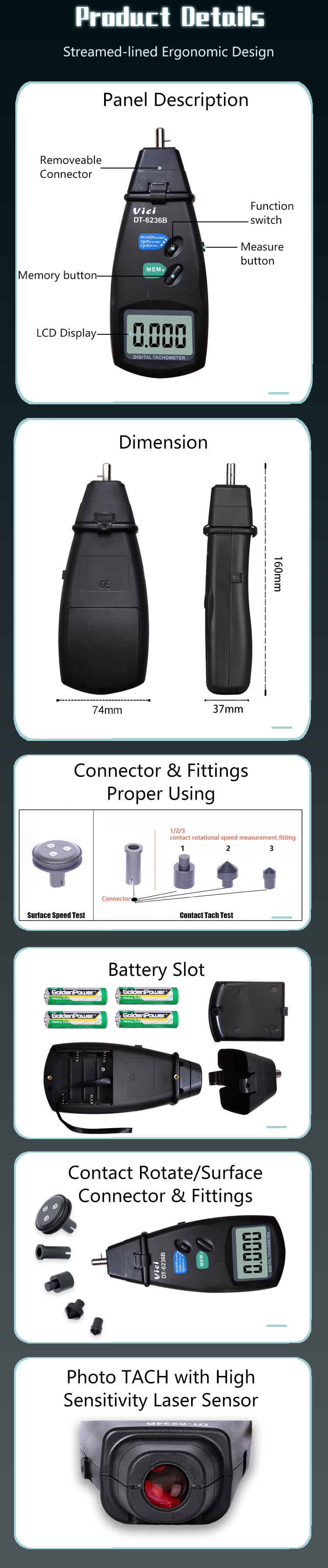 DT-6236B non-contact photo and contact rpm digital tachometer is mainly used for touchless speed testing of rotors such as various engines, motors, speed control devices and wire speed tests of various conveyor belts. It is used in the speed debugging of various devices such as aircraft, ships, EMUs, automobiles, model aircraft, toys, etc.; and the line speed debugging of assembly lines and transmission dials.