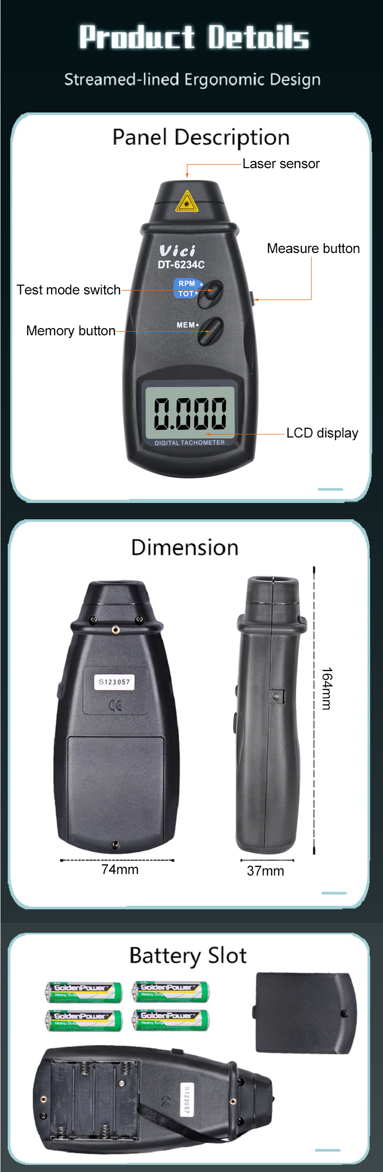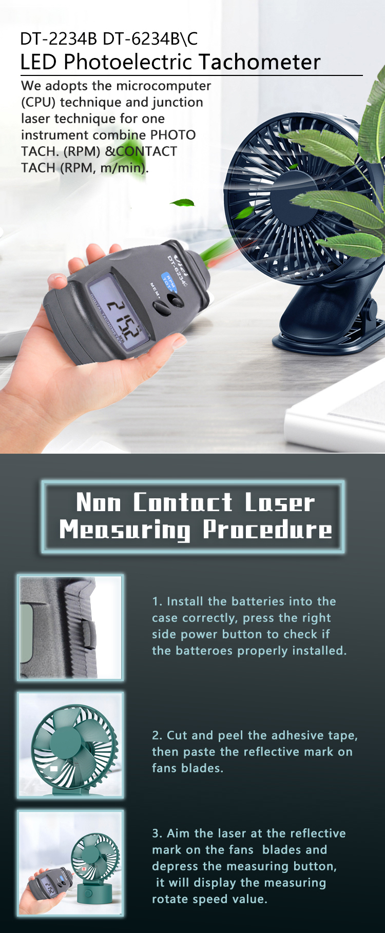 DT-6234C laser digital tachometer is used for touchless speed testing of rotors such as various engines, motors, speed control devices, etc. It is used in the debugging of various devices such as aircraft, ships, emmobiles, automobiles, model aircraft, and toys.