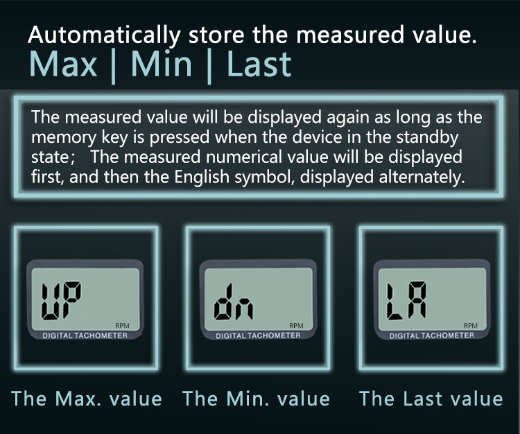 DT-6234B LED Photoelectric Tachometer, Automatically memory Max/Min/last value, Automatically store datas.
