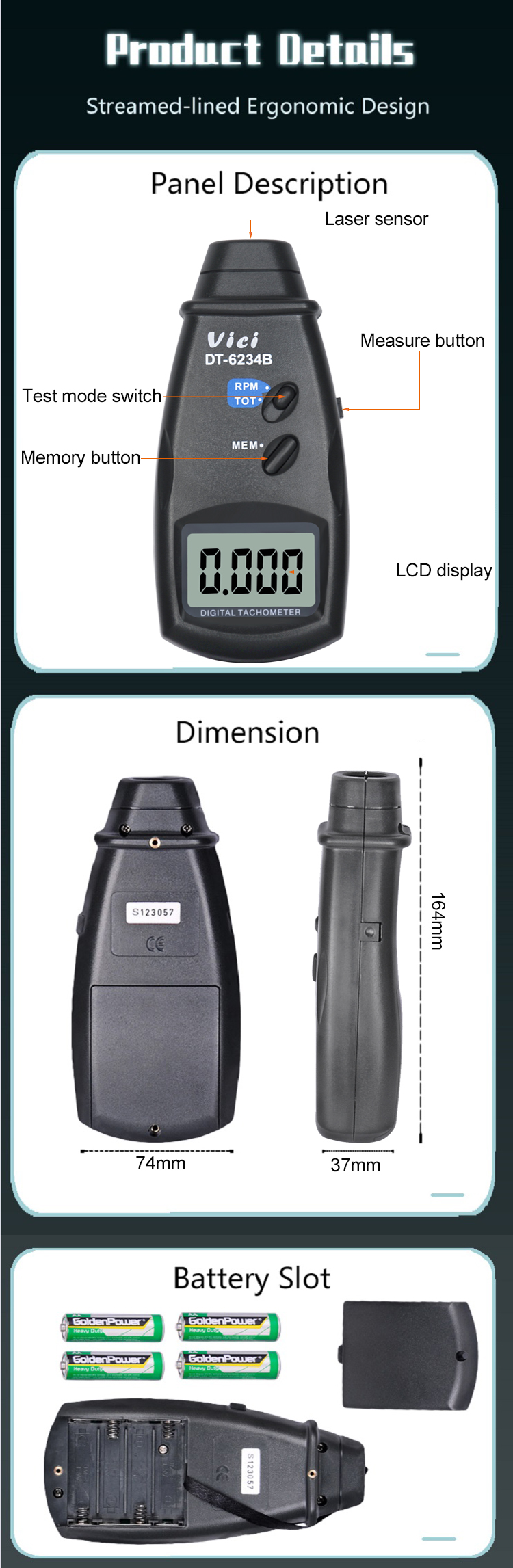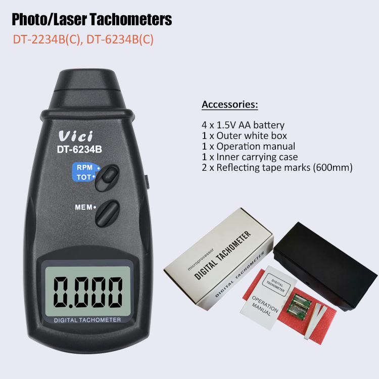 DT-6234B LED photoelectric digital tachometer is used for touchless speed testing of rotors such as various engines, motors, speed control devices, etc. It is used in the debugging of various devices such as aircraft, ships, emmobiles, automobiles, model aircraft, and toys.