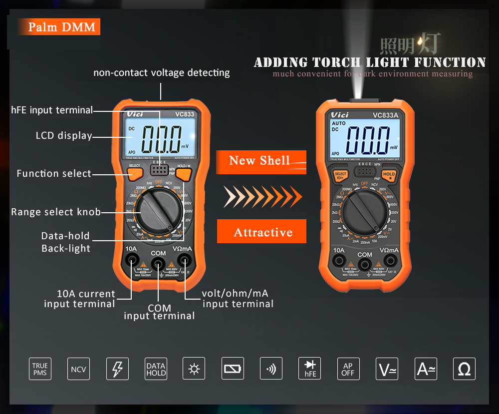 VC833A Manual ranging, True RMS, NCV test, Data hold, Backlight, Torch lighting function.