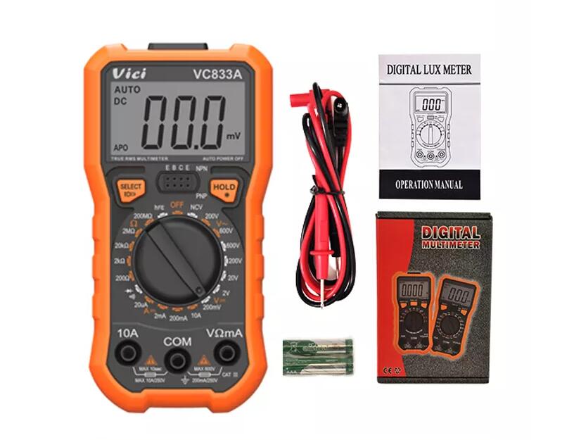 VC833A multimeter, available to DC voltage, AC voltage, DC current, AC current, Resistance, Non-contact voltage detecting, hFE, Diode and continuity alarm tests; Designed with unit symbol, backlight, data hold, torch lighting, auto power off and alarm functions; 2000 digits display.