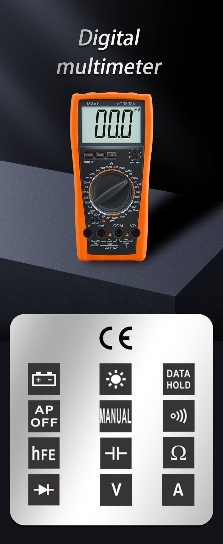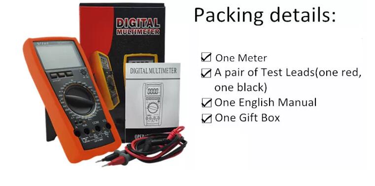 VC9802A+ multimeter is available to DC voltage, AC voltage, DC current, AC current, Resistance, Capacitance, hFE, Diode anc continuity alarm tests ; Designed with unit symbol, backlight, data hold, auto power off and protection function for error operations.