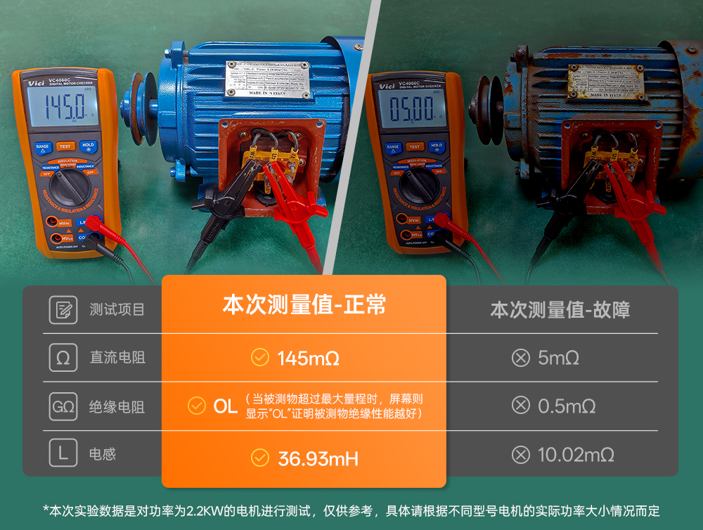 如何發現這些問題?測量直流電阻是最直觀的方法。正常繞組具有穩定的電阻值,而斷路時會顯示“OL”,匝間短路則表現為阻值異常偏低。 VC4060C具備毫歐級直流電阻測量能力,其200mΩ量程的分辨力高達0.1mΩ,能輕松識別這些微小變化,快速定位故障點。