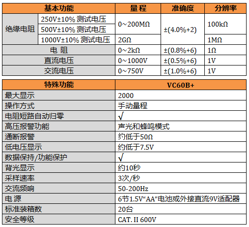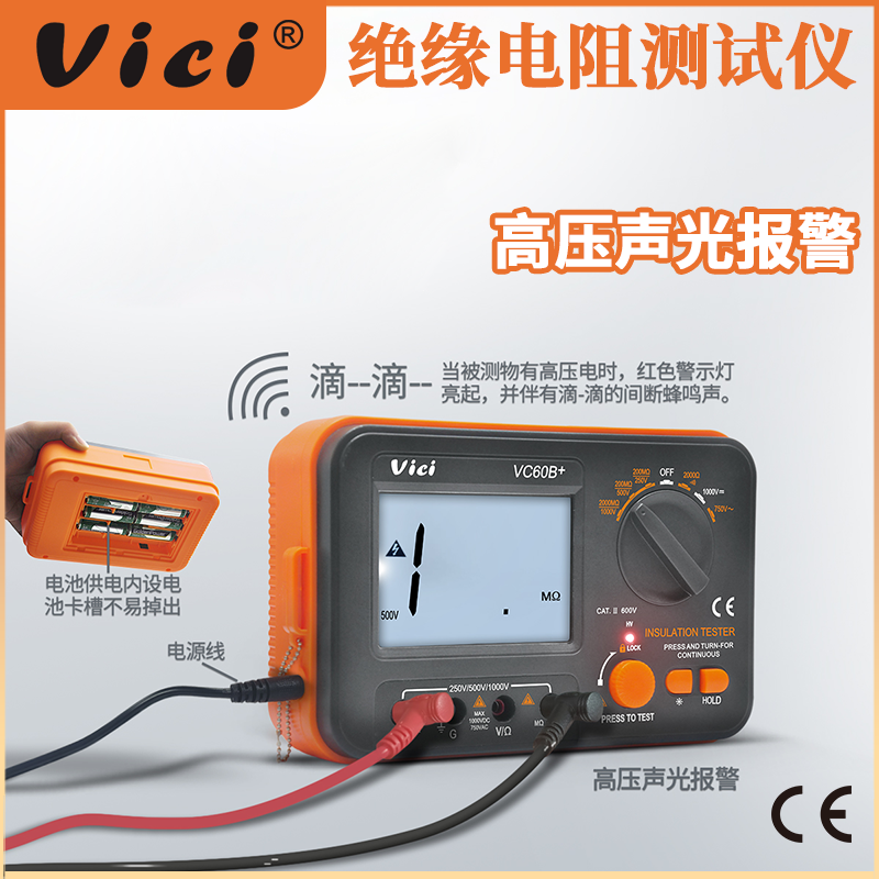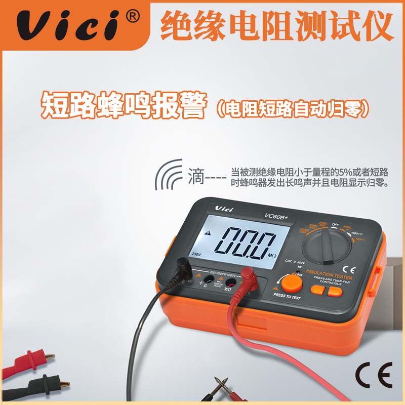 VC60B+ 絕緣電阻測試儀,具有高壓、輸入短路聲光報警,交直流電壓,電阻、通斷測量。