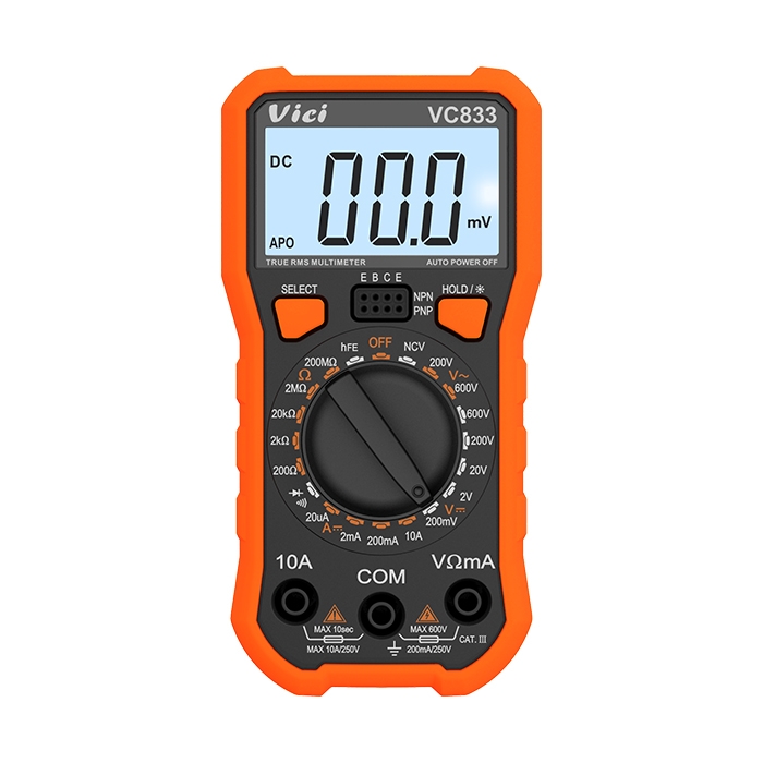 VC833 手動量程,真有效值測量,NCV測量,讀數(shù)保持,背光顯示。
